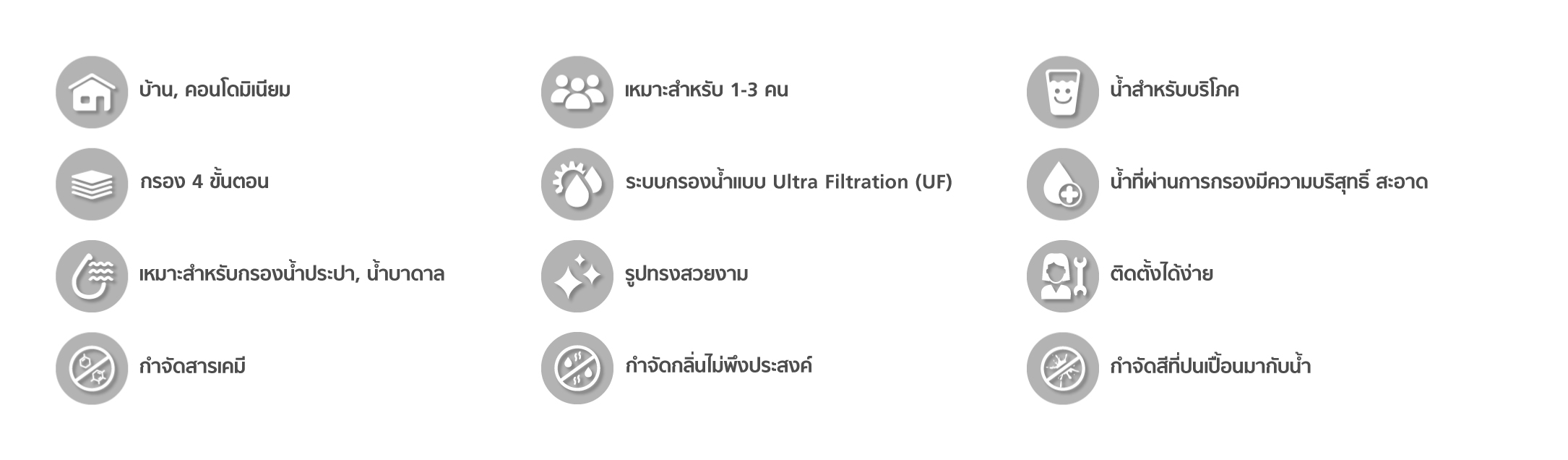 เครื่องกรองน้ำ 4 ขั้นตอน Ultra Filter (UF) ที่จะทำให้คุณมั่นใจได้ถึงความใสสะอาด กำจัดกลิ่น สี สารเคมี ได้ดี เหมาะสำหรับการผลิตน้ำดื่ม ในครัวเรือน ทั้งบ้านหรือ Condominium ออกแบบสวยงาม เรียบง่าย ใช้งานง่าย ติดตั้งและดูแลรักษาง่าย