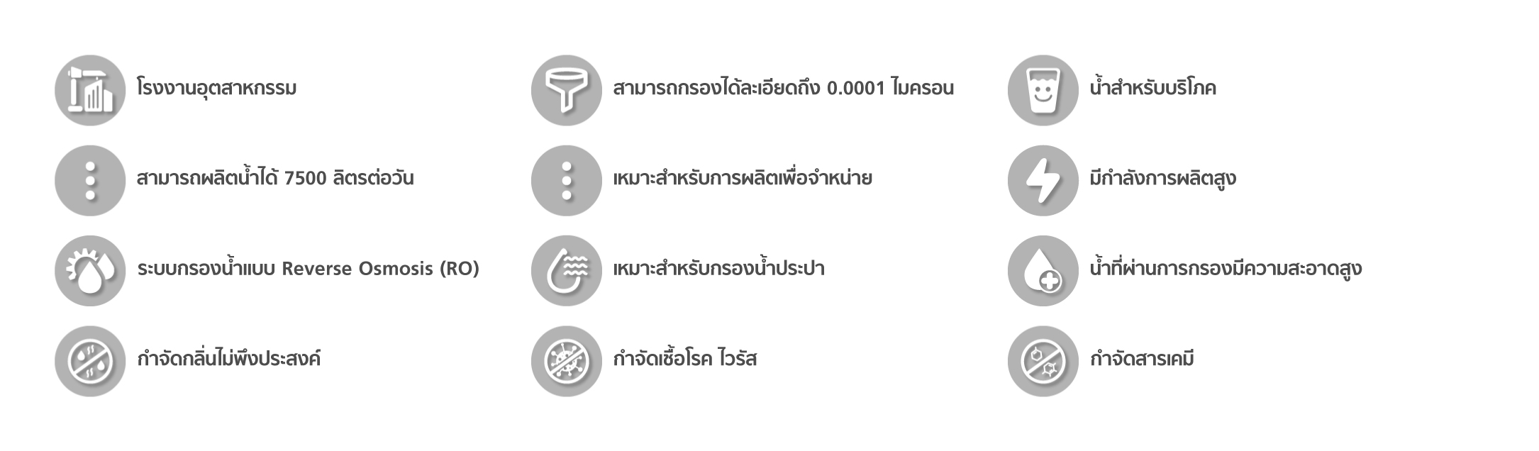 เครื่องกรองงานระบบ เหมาะสำหรับงานอุตสาหกรรม สามารถผลิตน้ำได้ 7500 ลิตรต่อวัน มีกำลังการผลิตสูง เหมาะกับการผลิตน้ำจำหน่าย หรือในโรงงาน โรงเรียน ตลาด ร้านอาหาร ที่ต้องการการผลิตจำนวนมาก