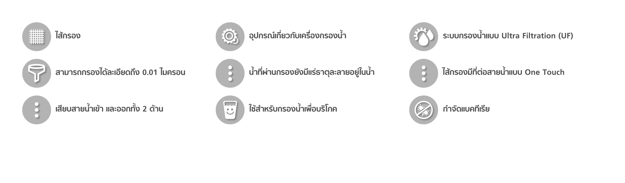ไส้กรอง UF Ultrafilter แบบแคปซูล ขนาด 12 นิ้ว ความละเอียด 0.01 ไมครอน ซึ่งถือว่าเป็นไส้กรองที่สำคัญที่สุดของระบบกรองน้ำชนิดนี้ สามารถกรองได้สะอาดระดับแบคทีเรียไม่สามารถผ่านเข้ามาได้ โดยยังคงรักษาแร่ธาตุต่างๆ ที่มีประโยชน์ต่อร่างกายไว้