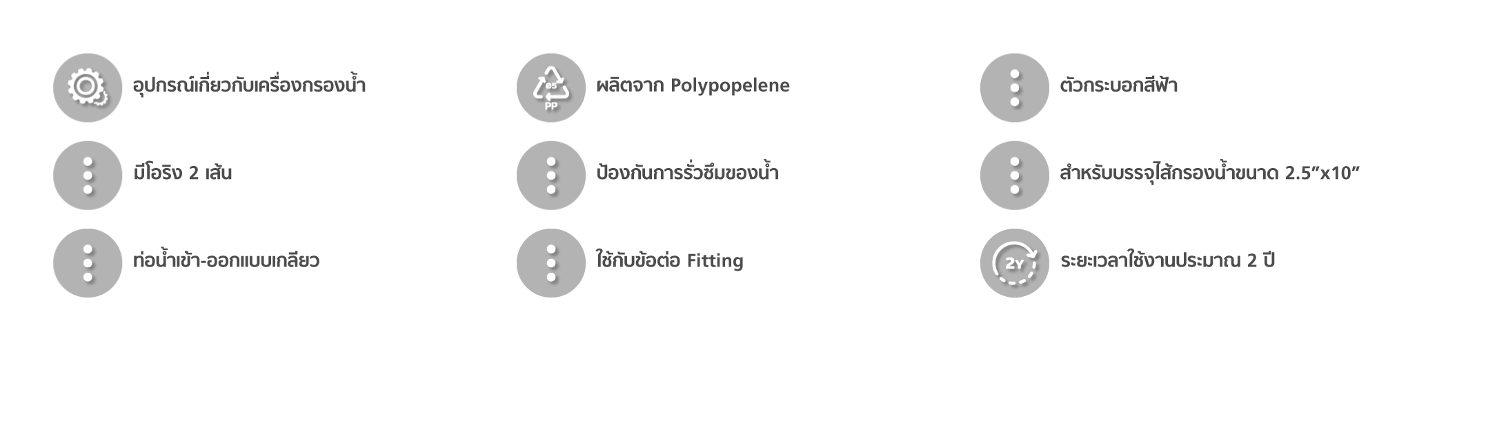 • ตัวกระบอกขนาด 10 นิ้ว ทำจากวัสดุ PP (Polypropelene) สีฟ้า