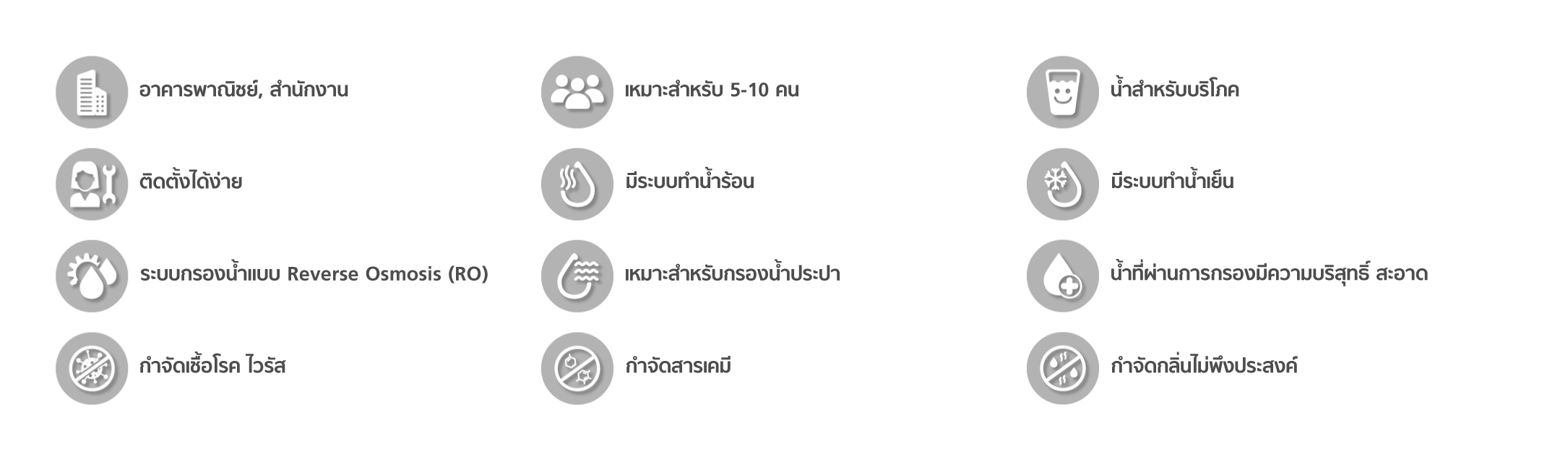 ตู้น้ำร้อน และน้ำเย็น RO เหมาะสำหรับครอบครัวใหญ่ ออฟฟิศ หรือ ตู้น้ำเพื่อบริการลูกค้า สะดวก ขนาดกะทัดรัด ออกแบบสวยงาม คุณภาพสูง ผลิตจากโรงงานมาตรฐาน กรองน้ำสะอาด บริสุทธิ๋ ปราศจากเชื่อโรคและโลหะหนัก มีถังเก็บน้ำขนาดใหญ่